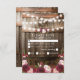 Country wedding rsvp cards featuring a rustic wood barrel background, twinkle string lights, burgundy & pink watercolor flowers, your monogram and an elegant editable wedding menu rsvp template.