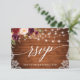 Rustic Wood, Modern Calligraphy Script, Watercolor Burgundy Marsala Floral Wedding Lace RSVP Card with Burgundy and Pink Roses. Glowing String Lights.