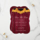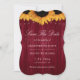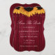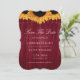 Rustic burgundy and sunflower wedding save the date card featuring sunflowers and string lights against a barn wood background. Two burlap hearts at the back.