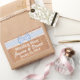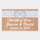 Sweet country charming wedding mini wine label sticker done in a burlap look. Graphics of white lace and a light blue and white gingham ribbon and bow stretch across the top. Personalize all the text for your wedding reception.
