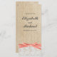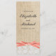 Un programme de mariage sur le thème de la campagne avec un design de burlap rustique avec dentelle blanche vintage et un ruban de faux corail. Les dessins sont des illustrations/graphiques imprimés - PAS RÉELLEMENT RIBBON. Parfait pour un mariage ou un mariage campagnard occidental. Customisez facilement pour votre événement.