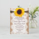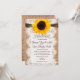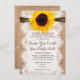 It features a rustic country printed burlap background on both sides of the invitation. The invitation has a printed lace embellishment over the top of the burlap. The top has a printed twine embellishment. And a bright yellow sunflower finishes it off, front and centre at the top of the invite. The burlap, lace, and twine are just printed designs. It is not actual burlap fabric or actual lace or twine.