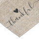 Rustic burlap table runner with thankful typography print for your festive thanksgiving dinner.