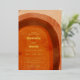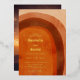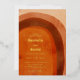 Boho wedding invitation with an abstract arch painted in earthy desert colours of burnt orange, terracotta, rust and brown. Your wedding details are in a modern layout along with your names in a retro style font for a fun twist. The back has your favourite photo. All text is printed with real gold foil.