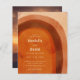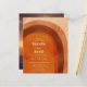 Boho style budget wedding invitation with an abstract arch painted in earthy desert colours of burnt orange, terracotta, rust and brown. Your wedding details are in a modern layout along with your names in a retro style font for a fun twist. The back has your favourite photo.