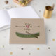 A wedding guestbook featuring an illustration of a green canoe and arrows on front. Personalize the text on front to include names and wedding date. Matching wedding invitations and other coordinating products are available at Jill's Paperie.