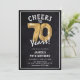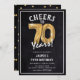 Celebrating turning 70! These 70th birthday party invites are designed with the title 'Cheers to 70 Years!'. Featuring a rustic chalkboard background, gold number seventy helium balloons, trendy white typography and a simple birthday party template that is easy to customize.