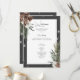 This wedding program design features a rustic green pine and pinecone bouquet on a soft charcoal black background with white flowers. It is accented with a white sparkle overlay to illustrate the magic of the beautiful winter holidays. Perfect for a Christmas or winter wedding. Created by Simply Farmhouse Press.