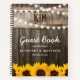 Carnet d'hôtes rustique chic mariage avec une grange de canne en chêne foncé arrière - plan, lumières à cordes scintillantes, tournesols, votre monogramme et modèle de livre d'or moderne qui est facile à personnaliser.