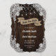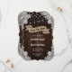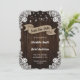 Custom rustic country wedding save the date card featuring a burlap ribbon against a rustic wood background adorned with string lights and white floral lace.