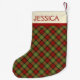 Personalized stocking with a rustic Christmas plaid pattern in moss green and red, with gold accents. Designed to hang facing either direction. Available in two sizes and three fabric types.