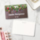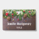 A name tag with a rustic photograph of a brown wooden table with pinecones, pine needles, snow, and Christmas ornaments. Festive and lovely.