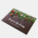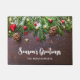 Season's Greetings door mat with a rustic photograph of a brown wooden table with pinecones, pine needles, snow, and Christmas ornaments. Festive and lovely.