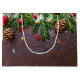 A gift bag with a rustic photograph of a brown wooden table with pinecones, pine needles, snow, and Christmas ornaments. Festive and lovely.