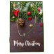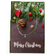 A gift bag with a rustic photograph of a brown wooden table with pinecones, pine needles, snow, and Christmas ornaments. Festive and lovely.