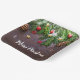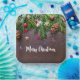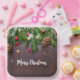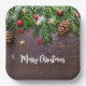 Paper plates with a rustic photograph of a brown wooden table with pinecones, pine needles, snow, and Christmas ornaments. Festive and lovely.