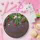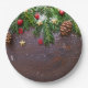 Paper plates with a rustic photograph of a brown wooden table with pinecones, pine needles, snow, and Christmas ornaments. Festive and lovely.