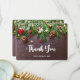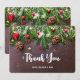 Flat thank You card with a rustic photograph of a brown wooden table with pinecones, pine needles, snow, and Christmas ornaments. Festive and lovely.
