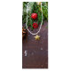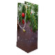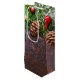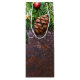 A gift bag with a rustic photograph of a brown wooden table with pinecones, pine needles, snow, and Christmas ornaments. Festive and lovely.