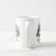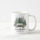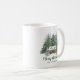 This personalized rustic woodland Christmas mug features a cozy cabin nestled in the snow covered pine forest.