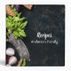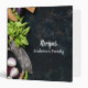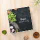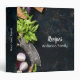 A cookbook binder for your favourite family recipes. Fresh food, herbs, basil onions, a wooden cutting Board a herbal chopper on a painter's dark rustic canvas with paint stains. Template for your text and family name.