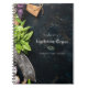 A cookbook notebook for a foodie and your favourite vegitarian recipes. On the cover: fresh food, herbs, basil onions, a wooden cutting board a herbal chopper on a painter's dark rustic canvas with paint stains. Personalize and add your name and text.