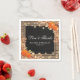 Rustic harvest wedding napkins featuring a country chic wooden background, black chalkboard centrepiece, rope, halloween pumpkins, fall foliage, acorns, a scattering of autumn leaves, string twinkle lights and a personalized text template.