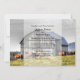 This wedding invitation features a charming rustic country barn with horses.