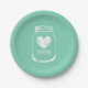 Mint green paper party plates with wedding monogram. Customizable colour and personalize name initial letters of bride and groom. Elegant typography in rustic country chic mason jar design. Cute romantic design with vintage heart icon. Faded weathered love symbol. Disposable plates for wedding, bridal shower, engagement, anniversary or bachelorette party. Customizable background colour. Perfect for outdoor barn wedding in summer around july, august, september.