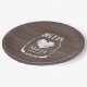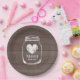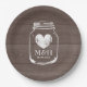 Wood grain panel paper party plates with wedding monogram plus date of marriage. Brown and white. Customizable colour and personalize name initial letters of bride and groom. Elegant typography in rustic country chic mason jar design. Cute romantic design with vintage heart icon. Faded weathered love symbol. Disposable plates for classy wedding, bridal shower, engagement, anniversary or bachelorette party. Customizable background colour. Perfect for outdoor barn wedding in summer around july, august, september.