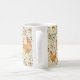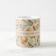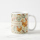 A cute rustic country farm coffee mug, with painted chickens and flowers pattern, and your family name, with an earthy vibe. Gold, green and cream.