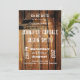 Un style typographique cool invitation mariage campagnard rustique avec grange rustique en haut à gauche et un fer à cheval à droite. L'arrière - plan est riche mais en détresse arrière - plan d'impression en bois de grange foncé.