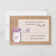 Cette carte de réponse RSVP rustique faire-part de mariage est parfaite pour un mariage campagnard. Il présente une conception de burlap imprimé avec un bocal de maçon que l'arc à ficelle noué autour. Le bocal de mason est une teinte de violet, et le libellé RSVP a des accents de la même couleur pourpre. Ils sont très bons pour les mariées aux couleurs mariages violet. Ces cartes de réponse mariages sont conçues pour correspondre aux invitations de mariage pour les burlap de pays :
