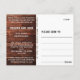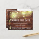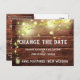 Rustic country wedding wood mason jar string of lights tree branch with green leaves Change the Date postcard. The glowing string of lights illuminate the green leaves against a beautiful rustic dark brown wood. This rustic wedding design is customizable and perfect for your beautiful outdoor country wedding or western wedding.
