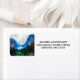 Étiquettes de adresse avec une belle photo d'une agréable et tranquille scène nature. Forêt verdoyante à l'avant et montagnes bleues à l'arrière. Avec un ciel blanc nuageux et onirique. Ambiance mélancolique et magique.