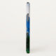 Phone case with a beautiful photograph of a pleasant and tranquil nature scene. Vibrant green forest in the front and shadowy blue mountains in the back. With a dreamy cloudy white sky. Misty and magical feel.