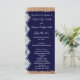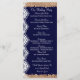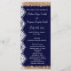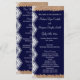 Les programmes de mariage verticaux ont un arrière - plan de marine et une dentelle imprimée et un burlap design autour des bords. Ajoutez l'ordre de cérémonie et l'information de la fête de mariage de votre mariage à l'avant et à l'arrière du programme. Vous pouvez ajouter ou supprimer des champs de texte à partir du bouton "Customiser".