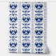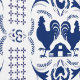 Blue and white country rustic decor pattern featuring back to back roosters and a barn with additional floral style (floralia) details by Holiday Hearts Designs.