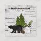 This rustic country business card design features a silhouette bear standing with pine trees and country decor on a faux birch tree bark background.