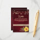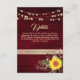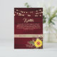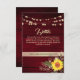 Elegant, country, rustic wood burgundy wedding details card with website, sunflower, vintage gold floral lace and string lights.
