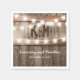 Rustic wedding napkins featuring a barn oak barrel background, twinkle string lights, your monogram, wedding date and your names.