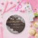 Elegant and romantic rustic wedding party paper plates inspired by barn wood, white floral lace and string lights.
