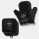 Modern black and white Custom branded Oven Mitt & Pot Holder Set features a business logo design centred on the front and framed by custom text that can be personalized with the name of the company, location, slogan, website, or other info. Black background and white text colours can be modified.