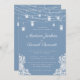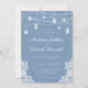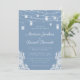 This lovely dusty blue invitation to a wedding ceremony with string lights and mason jars at the top and beautiful lace edges at the bottom is light, airy and charming. The fonts are crisp and modern while being classic and traditional. It is perfect for any wedding theme. Guests will be delighted to share your joy and happiness at your wedding ceremony. It's so easy to make your own. Simply select Personalize this template, type in your information and in seconds you can see your unique and beautiful invitations.