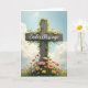 This design shows a weathered wooden cross standing tall in a spring field, wrapped with leafy green vines and small daisy-like flowers in white and yellow. Just beneath the horizontal beam, the words “Easter Blessings” appear in bright white lettering, centered so they read clearly against the darker wood. Around the base, a dense spread of spring blooms in pink, soft orange, sunny yellow, and creamy white gathers like a gentle offering, the colors leaning close together the way friends might in a quiet moment 🌷. The green meadow stretches back into the distance, giving the scene space to breathe while keeping the focus on the cross. Above it all, a clear blue sky opens up with a few soft, rounded white clouds drifting by, adding a calm, open-air backdrop. Light falls across the wood grain, the leaves, and the petals, making the flowers look freshly opened as if leaning in toward one another 🐰. The brightest cluster of blossoms sits right at the foot of the cross, with yellow petals catching the sun against deep green grass. To share Easter sentiments.
