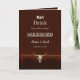 Country western cowboy eat drink married fun brown wood wedding announcement vertical folded card. Rustic bull skull. Use a little humour with these cute, funny farmhouse style invitations. Eat, Drink, cause we're gettin' Married can be personalized. Trendy, old wild west vintage antique style design. Cool farm animal. Personalize your typography. Image copyright Marg Seregelyi Photography.