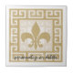 The rustic elegance of this decorative tile will enhance any decor. The tile features a gold Fleur de Lis symbol in a Greek Key pattern design. Personalize with your name or message or delete the text and keep just the design.