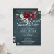 Invitation de pendaison de crémaillère élégante et chic pour l'hiver sur un tableau noir de couleur bleu marine minuit foncé avec un magnifique bouquet de roses peonies rouges burgundy et blanches avec feuillage vert foncé, guirlandes de lumières scintillantes blanches, et une écriture calligraphiée à la main. ++++++++++++++ Facile à personnaliser avec vos détails ! +++++++++++++++ L'invitation convient pour des célébrations élégantes et rustiques de nouvel an, Noël, maison de campagne / ferme / cottage dans un cadre hivernal.