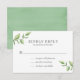 Rustic wedding rsvp card featuring a simple design with green watercolor painted sprigs with large leaves in the upper left and lower right corners, over a white background. The backside has a light green watercolor wash. An elegant botanical design that is great for a celebration in the summer.