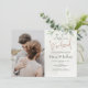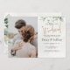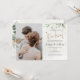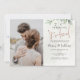 Virtual wedding invitation features a rustic floral eucalyptus theme accented with faux gold glitter against a pale cream coloured background. Customize with your photo, names, date, important details, and include your initials on back of card.